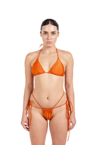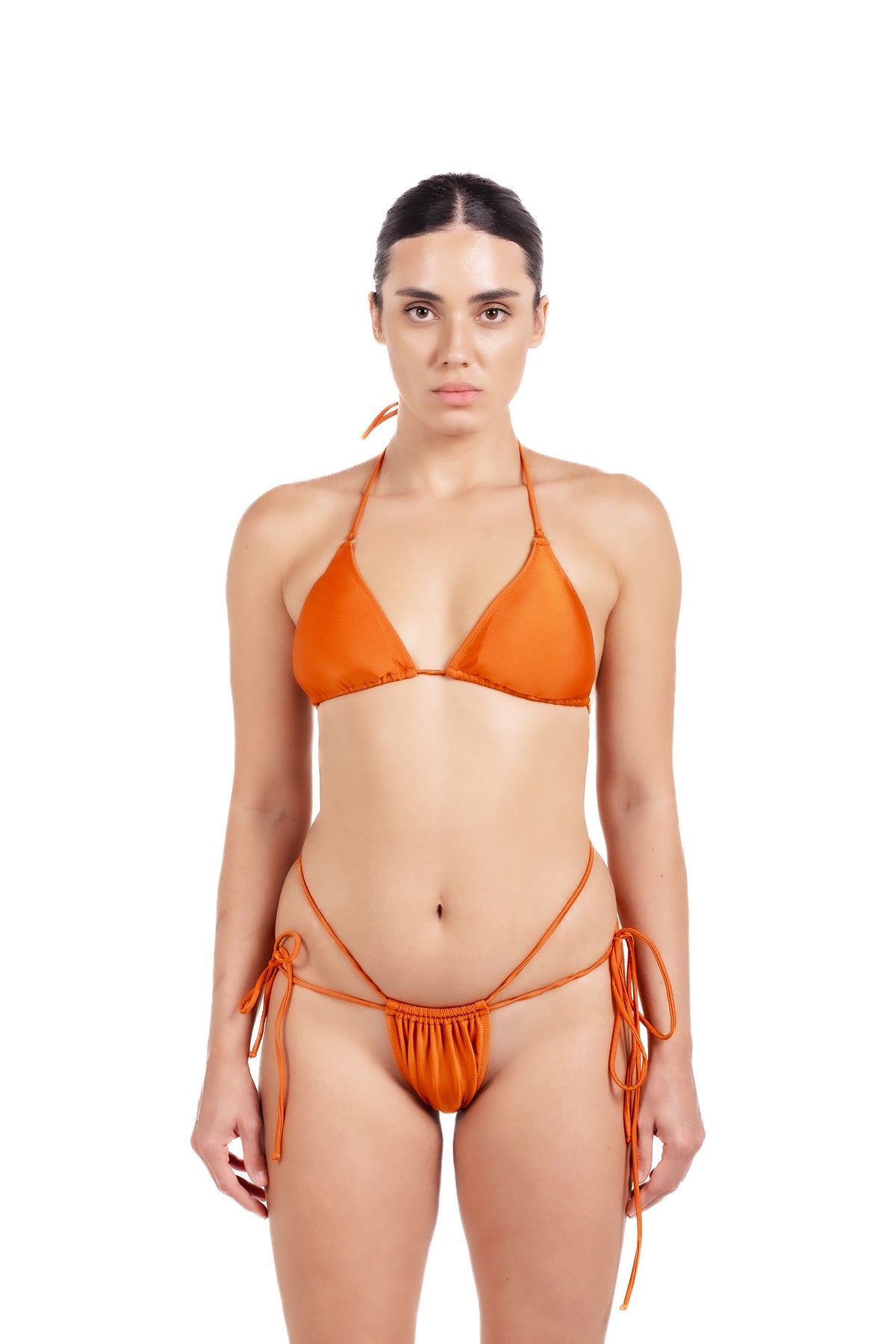 Crafted with a classic triangle top, Eden features adjustable ties at the neck and back for a custom, comfortable fit. The top’s sleek, smooth finish enhances the natural shape, offering a timeless yet contemporary appeal. The standout detail of the set is the ultra-minimal ruched bottom, complete with delicate side ties that allow you to personalize coverage while creating a beautifully sculpted, high-leg silhouette.