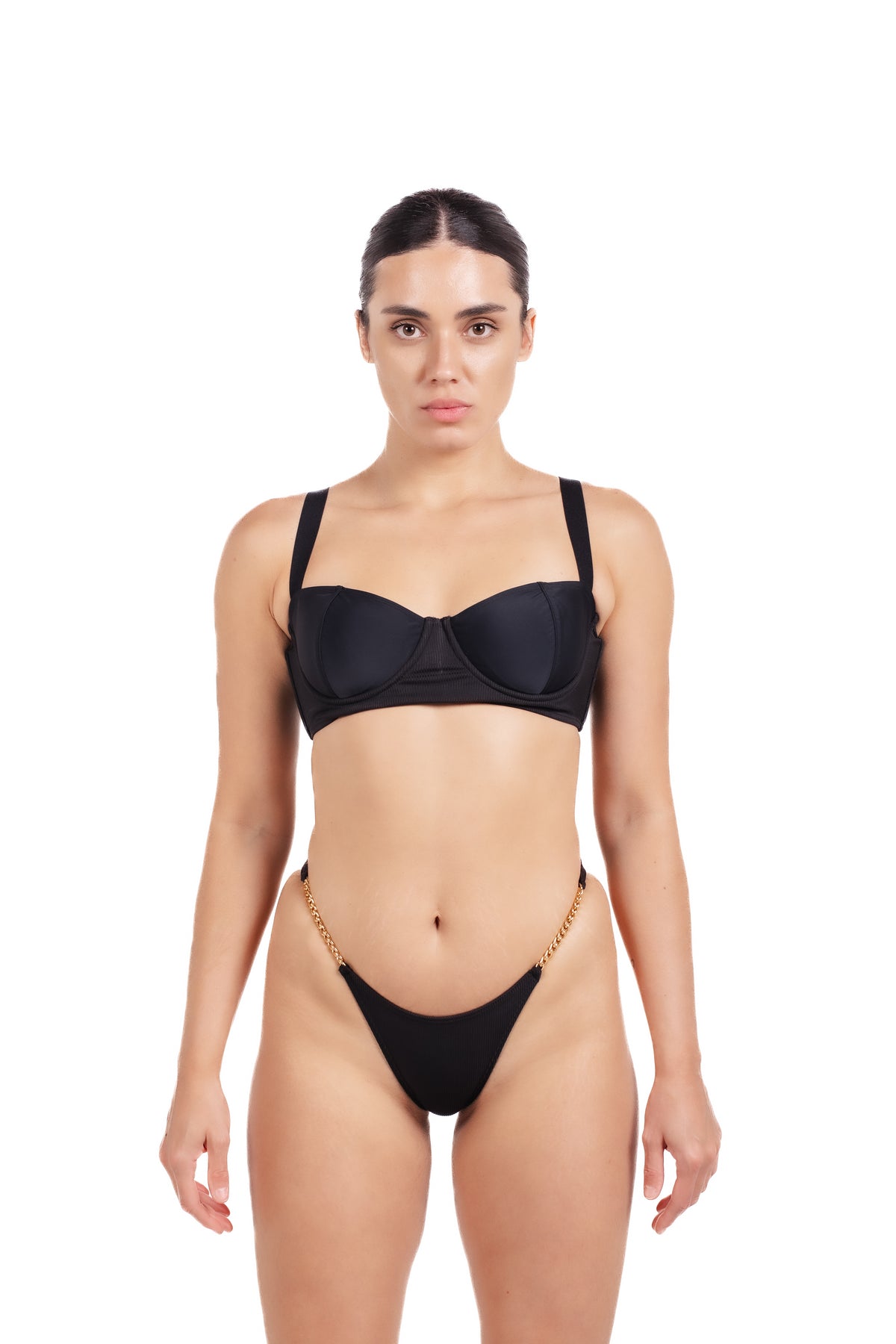 The structured underwire top features wide, comfortable straps that provide lift and shape while maintaining an effortlessly elegant look. Its balconette-inspired design enhances the natural curves of the bust, making Grace both flattering and fashion-forward. Paired with it, the high-cut bottoms elongate the legs and highlight the waistline. The standout detail—refined gold chain straps—adds a touch of glamour and elevates the minimalist black design into a true statement piece.