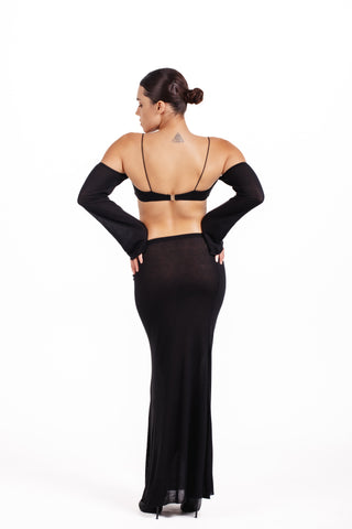 The set features a sleek bandeau-inspired top with ultra-thin straps that frame the shoulders, paired with dramatic off-shoulder sleeves that add movement and sensuality. The open-back design, finished with a delicate gold-tone clasp, enhances the silhouette with subtle sophistication.