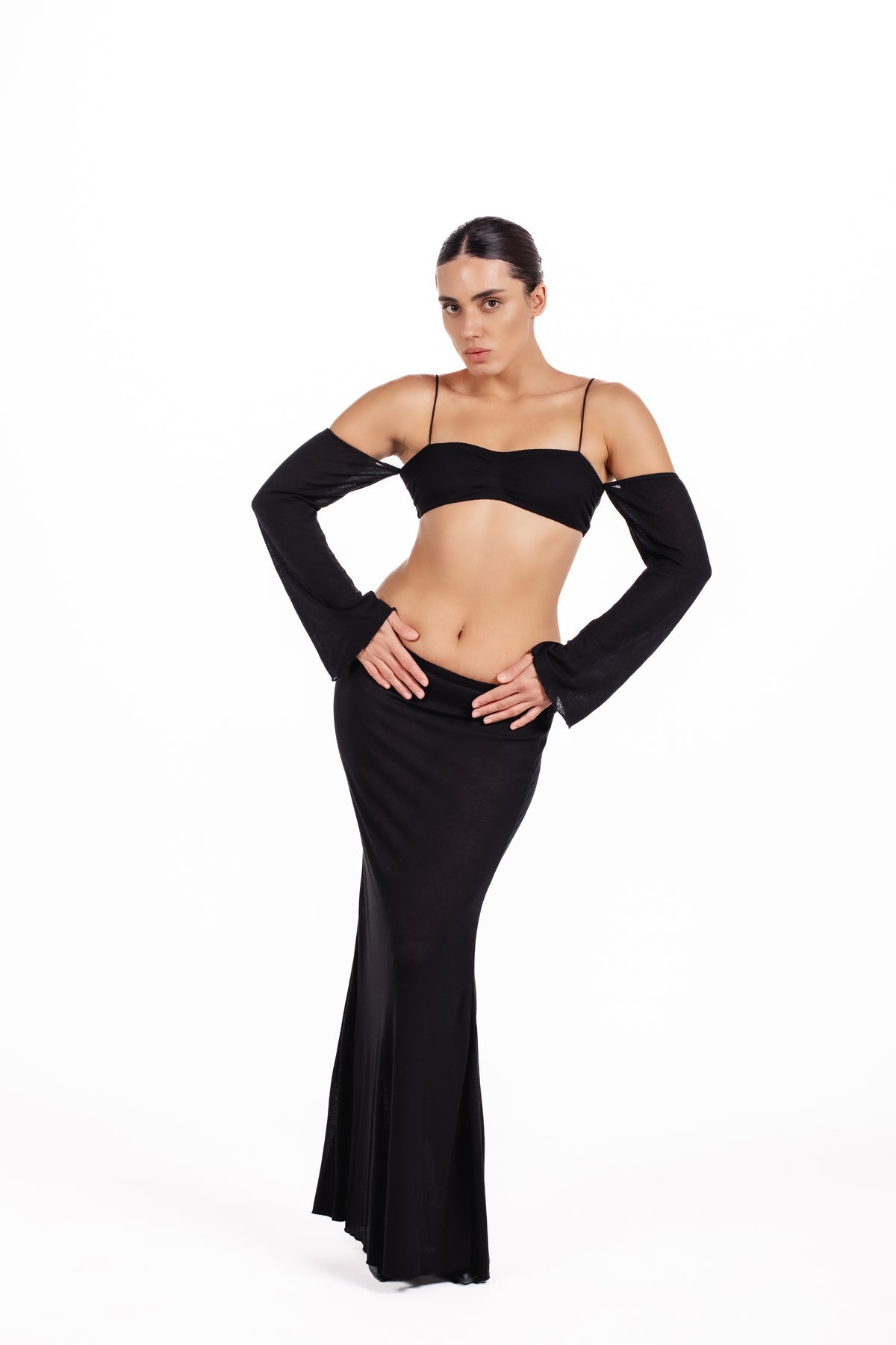 The full-length skirt drapes beautifully over the body, crafted from a lightweight, semi-sheer knit that elongates the figure while embracing every curve. Its fitted form and fluid hemline create a refined yet provocative look that transitions seamlessly from sunset gatherings to late-night elegance.