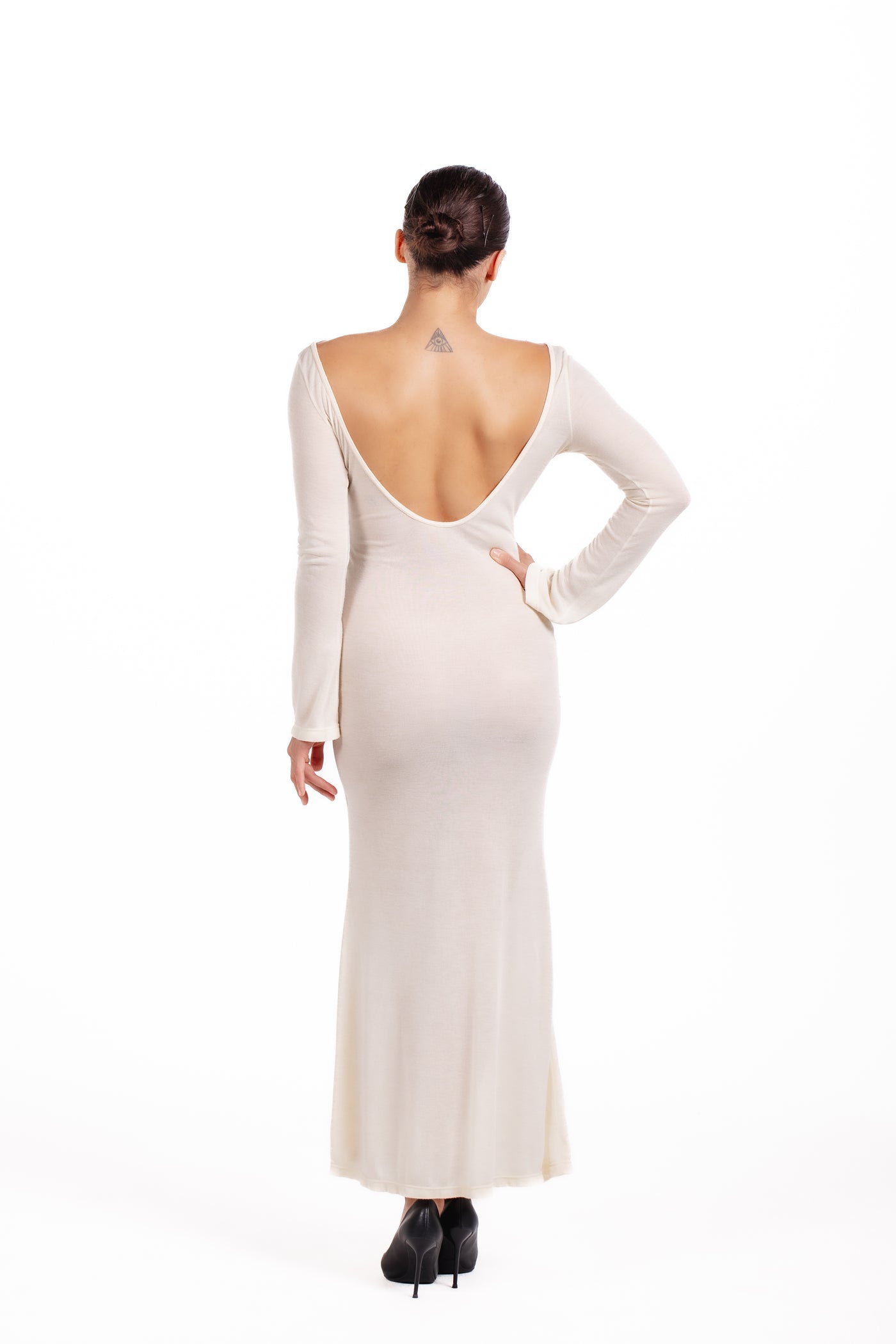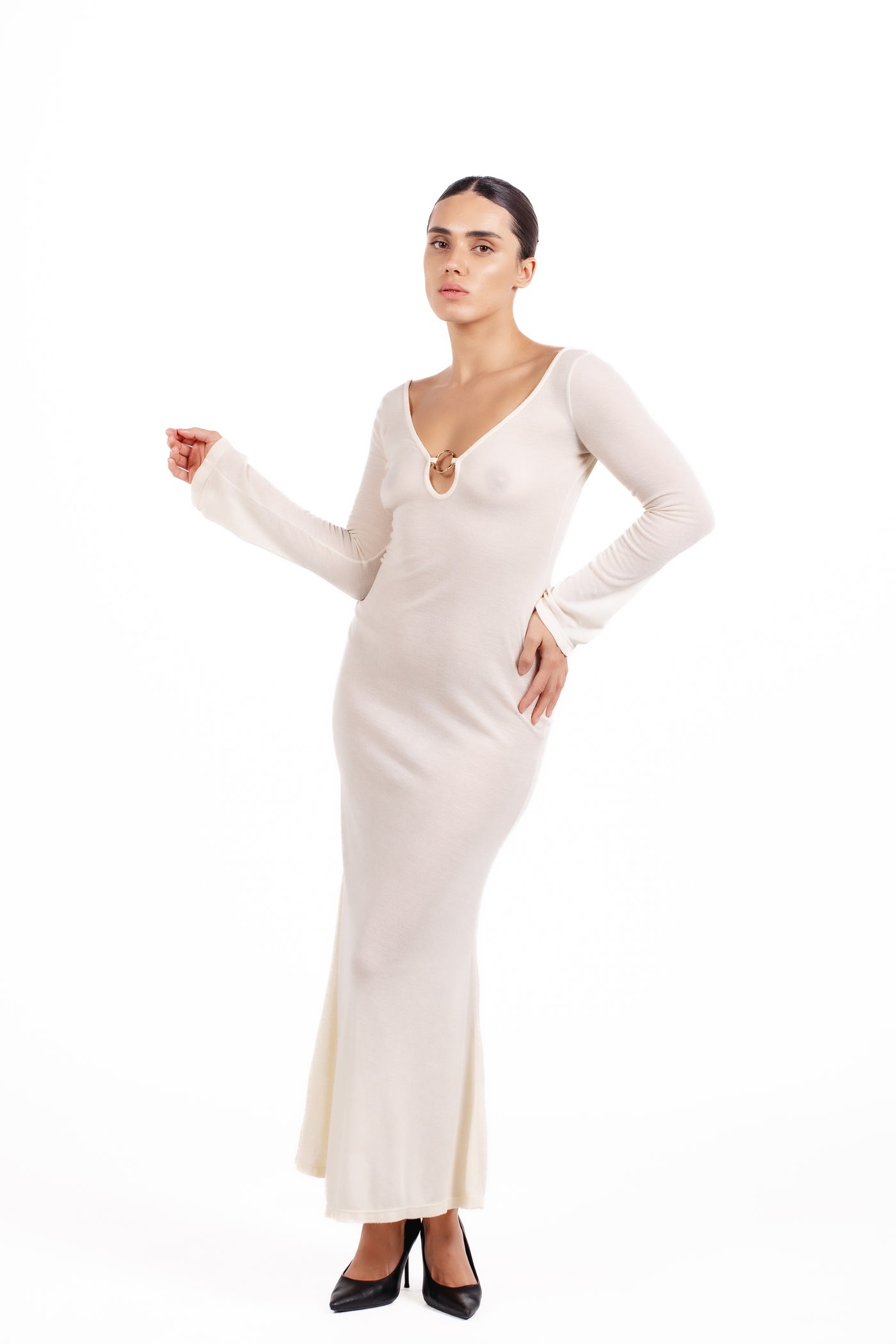 This floor-length dress features a deep scoop back that adds a striking, sensual element while maintaining an effortlessly refined silhouette. The front showcases a delicate keyhole detail secured with a subtle ring accent, creating a focal point that elevates the minimal design. Long, gently flared sleeves add fluidity and balance, enhancing the dress’s soft, elongated shape.