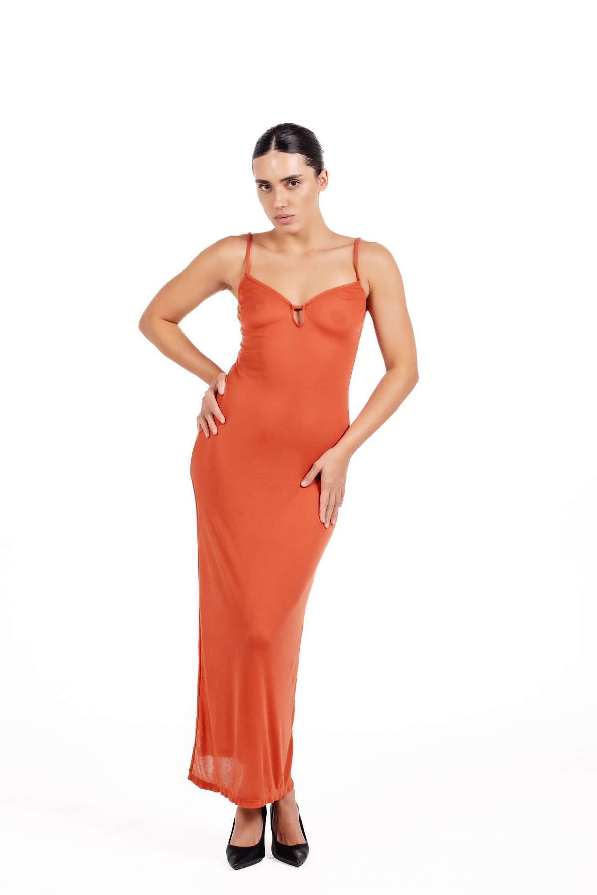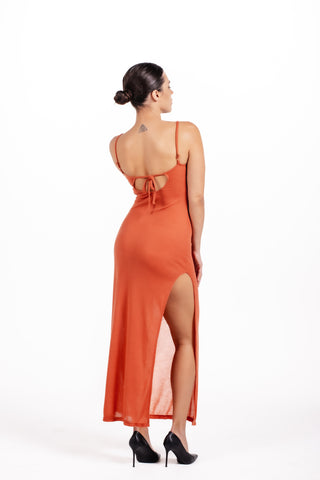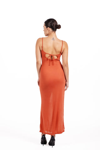 Crafted in a rich terracotta hue that enhances every skin tone, Layla features a soft, body-skimming silhouette that moves gracefully with the wearer. The delicate adjustable straps ensure a custom fit, while the deep scoop back with a subtle tie detail adds an irresistible touch of allure.