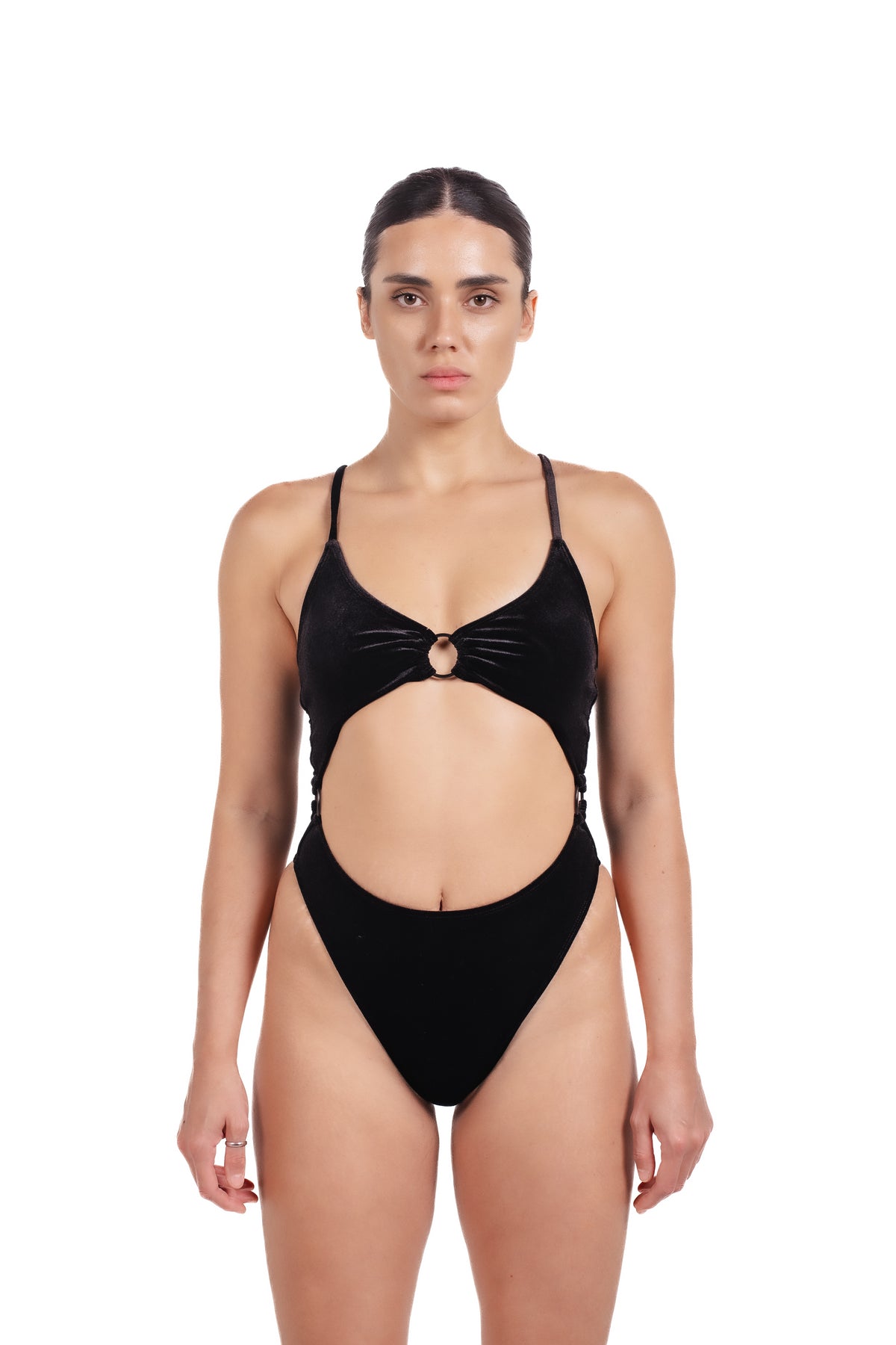 The front features a sculpting fit with a central ring detail that gathers the bust and creates a striking cut-out shape. Adjustable shoulder straps ensure personalized comfort, while the high-cut leg elongates the figure and enhances natural curves with a sleek, streamlined finish.