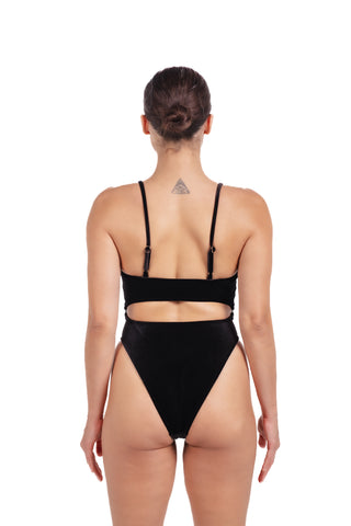 At the back, an open cut-out sits above the waistline, adding dimension and allure while maintaining a clean, minimal aesthetic. The soft velvet texture catches the light beautifully, making Milan perfect for both poolside lounging and sunset soirées. Versatile, refined, and unapologetically chic — Milan Black Velvet brings modern sensuality to classic swimwear design.